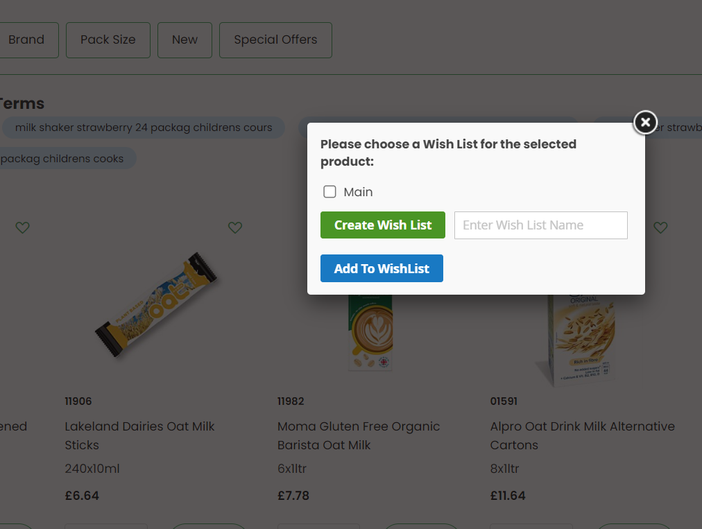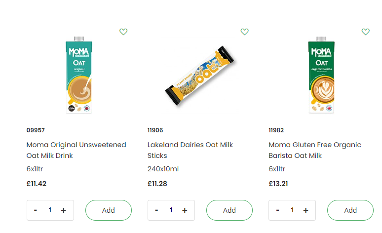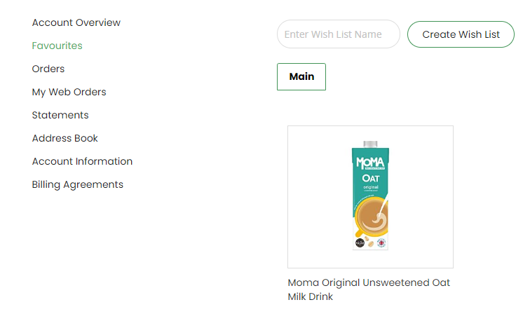 You can easily select your favourite products by clicking on the heart icon next to each product. A pop up will appear, and you can then choose to add this to an existing Favourites list (or wish list) or create a new one e.g. dairy-free, to help you personalise how you process your orders.