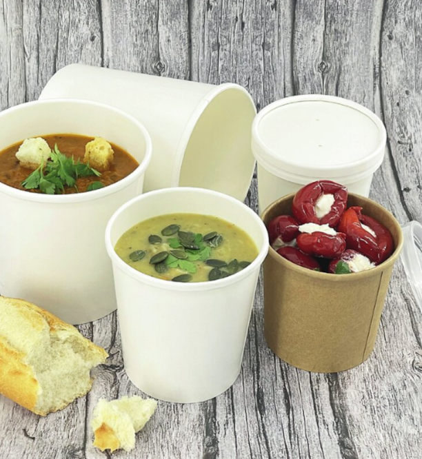 One of our favourite products are these white ‘soup cups’ and lids (also great for takeaway noodles, curries, porridge etc - not just soup!). These versatile and attractive pots come in three different sizes – 12oz, 16oz and 32oz - with leak proof lids, for ultimate convenience. The 12oz is made from a cardboard pulp with a plant-based bioplastic PLA lining, making it fully compostable in a commercial composter.